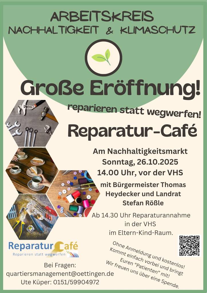 Lange haben wir vom Arbeitskreis für Nachhaltigkeit & Klimaschutz darauf hingearbeitet – nun ist es so weit: Das Reparatur-Café Oettingen öffnet am 26.10.25 im Rahmen des Herbstmarktes seine Pforten.