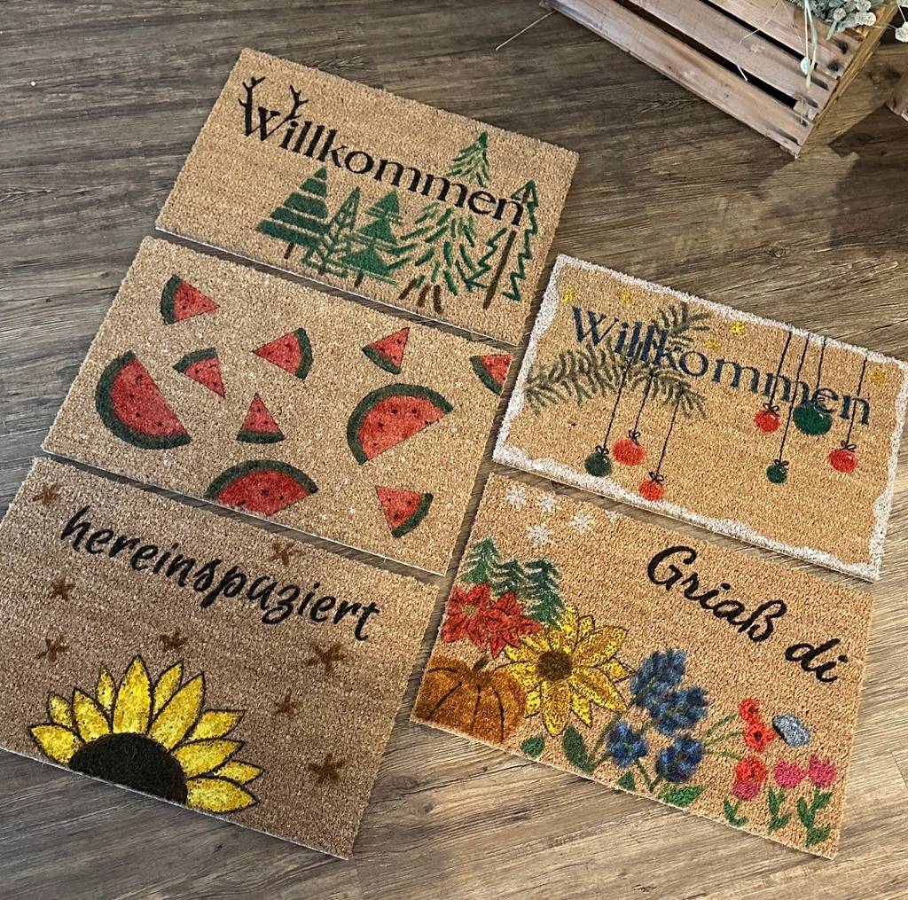Viele Farben, Schablonen und eine Kokosfußmatte stehen zur Verfügung. Durch Vorlagen oder durch Deine Kreativität wird dadurch ein toller Fußabstreifer entstehen. Schritt für Schritt wird die Technik erklärt, die jeder beherrschen kann.