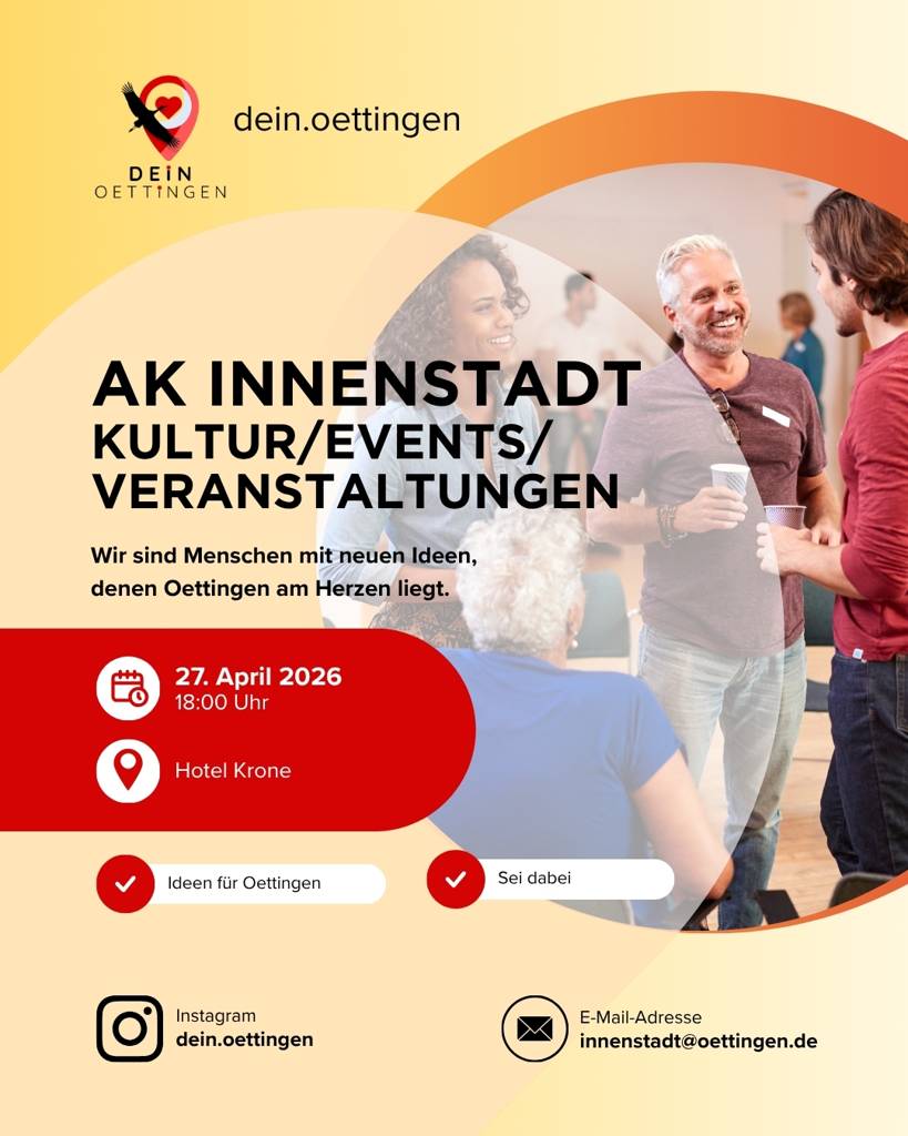 Gestalte Oettingen mit uns! Das nächste Treffen der PG Kultur, Events und Veranstaltungen des AK Innenstadt findet statt am Montag 27. April 2026 um 18.00 Uhr im Hotel Krone. Interessierte sind herzlich willkommen!